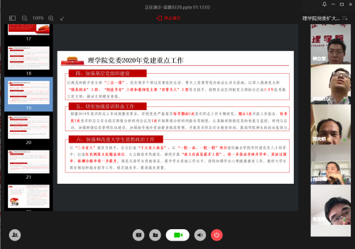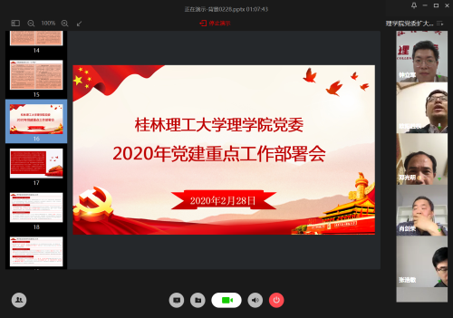 2月28日下午,理学院党委召开2020年党建重点工作部署网络视频会议,安排部署新学期学院党建工作。会议由学院党委书记欧阳胜权主持,学院党委副书记、院长肖剑荣、党委副书记钟立军、副院长张富文、蒋远营、李明,院长助理张浩敏、党委委员邓光明以及各党支部书记参加会议。