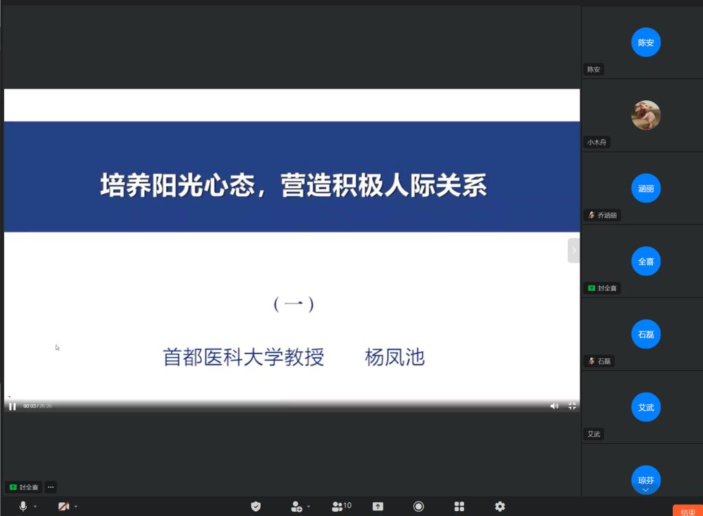 本次学习活动全体教职员工通过网络视频的方式观看了主讲专家杨凤池教授关于《培养阳光心态 营造积极人际关系》为主题的课程。课程首先通过阳光心态与阴暗心态的对比,介绍了阳光心态的内涵,阐述了压力的来源主要有工作压力、人际关系、家庭问题、个人职业生涯发展等四个方面;其次,从主观世界方面阐述了压力的来源主要有不合理的想象、不恰当的比较、不善于换位思考等三个方面,并结合相关案例介绍了不合理的比较会带来压力,通过理性评价现实、情绪愉快稳定等方法可拥有阳光心态;最后论述了有效沟通的内涵、良好沟通的三要素、职场沟通的方法。