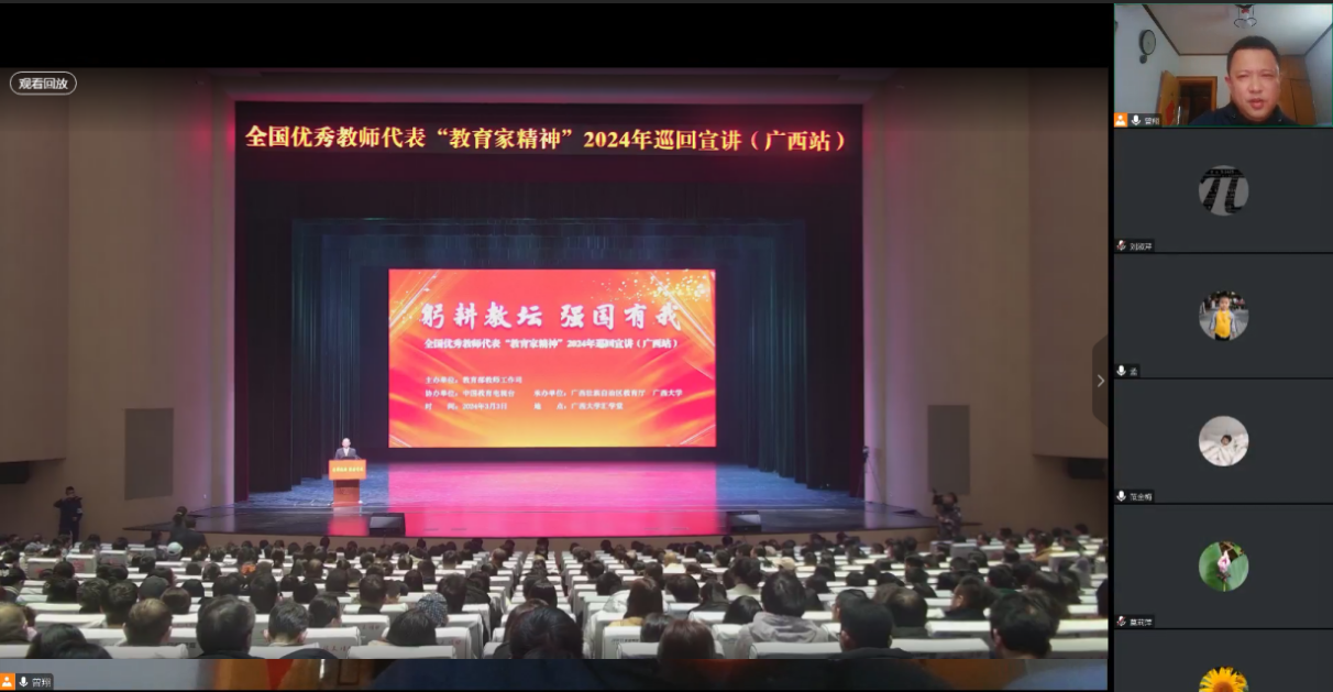 3月3日上午,全国优秀教师代表“教育家精神”2024年巡回宣讲在广西大学汇学堂顺利举办,全国六位宣讲团成员作为代表在广西开展教育家精神宣讲。3月4日-7日学院以各教研室、办公室为单位组织教师线上方式集中观看了此次宣讲的回放,并进行了学习交流。