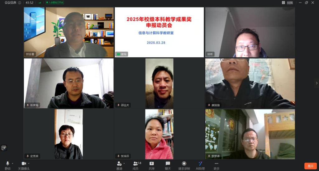 为了更好地组织谋划2025年本科教学成果奖,信息与计算科学教研室3月28日利用钉钉会议开展了举行2025年校级本科教学成果奖申报动员会,学院副院长唐国强和封全喜以及教研室全体教师参加动员会。动员会由教研室主任谢海主持。