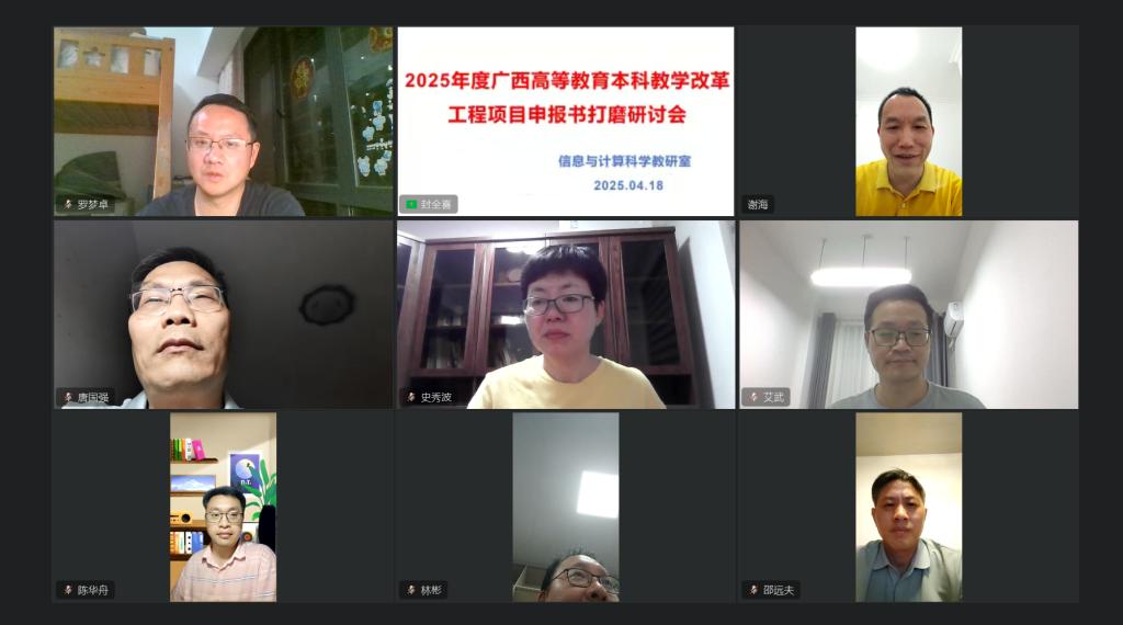 为了进一步提高2025年度广西高等教育本科教学改革工程项目申报书质量,信息与计算科学教研室4月18日利用钉钉会议开展了2025年度广西高等教育本科教学改革工程项目申报书打磨研讨会,学院副院长唐国强和封全喜以及教研室全体教师出席研讨会。研讨会由教研室主任谢海主持。
