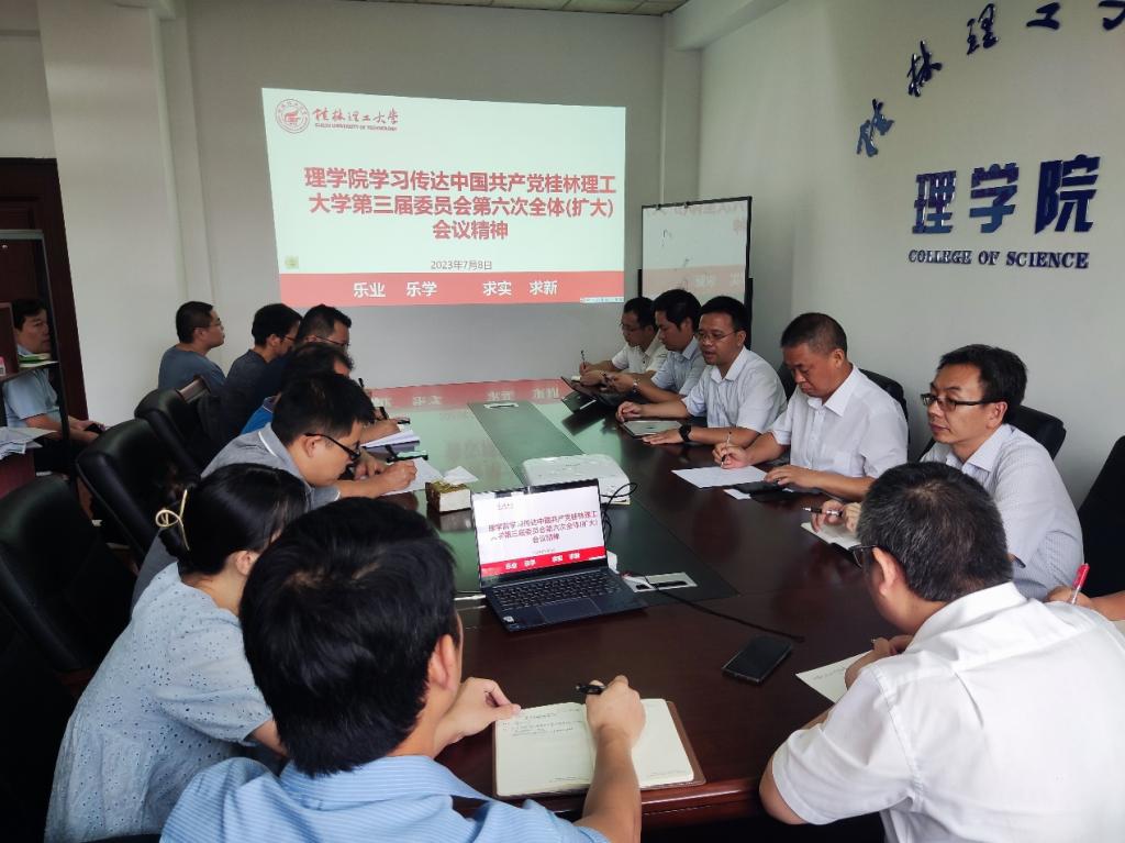 7月8日上午11:00,理学院在屏风校区1409会议室召开专题会议,学习贯彻落实学校第三届党委第六次全体(扩大)会议精神。学院领导班子成员、院长助理、各教研室(实验室)主任、党政办公室主任、学工组长、团委书记等参加了会议,会议由学院党委书记欧阳胜权主持。