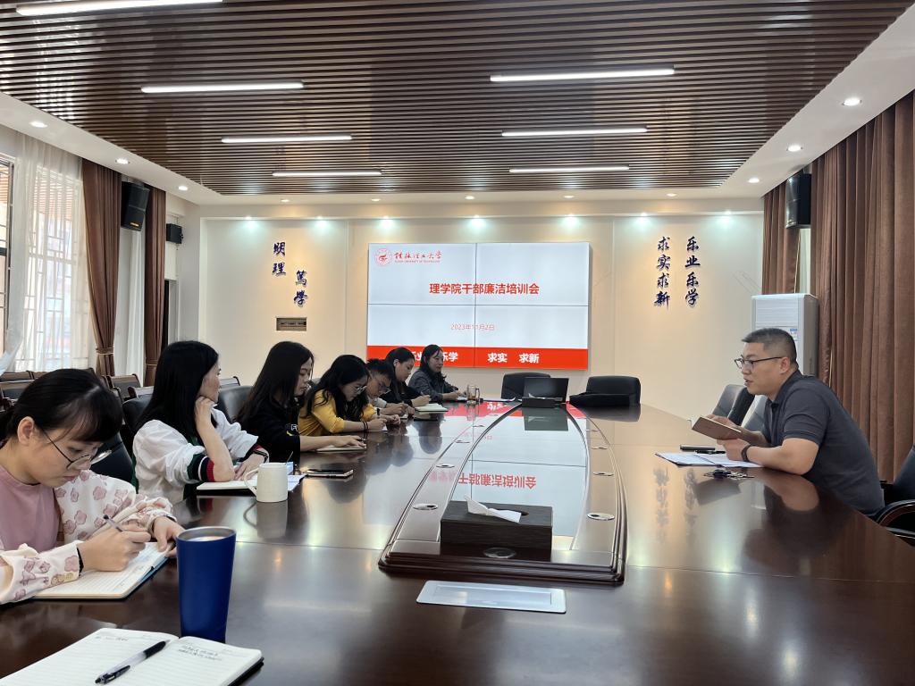 为持续深化党风廉政建设和反腐败斗争,落实“清廉学院” 建设有关要求,11月2 日,学院在08201会议室召开理学院干部廉洁培训会,学院党员领导干部、支部书记参加会议,会议由学院党委副书记钟立军主持。