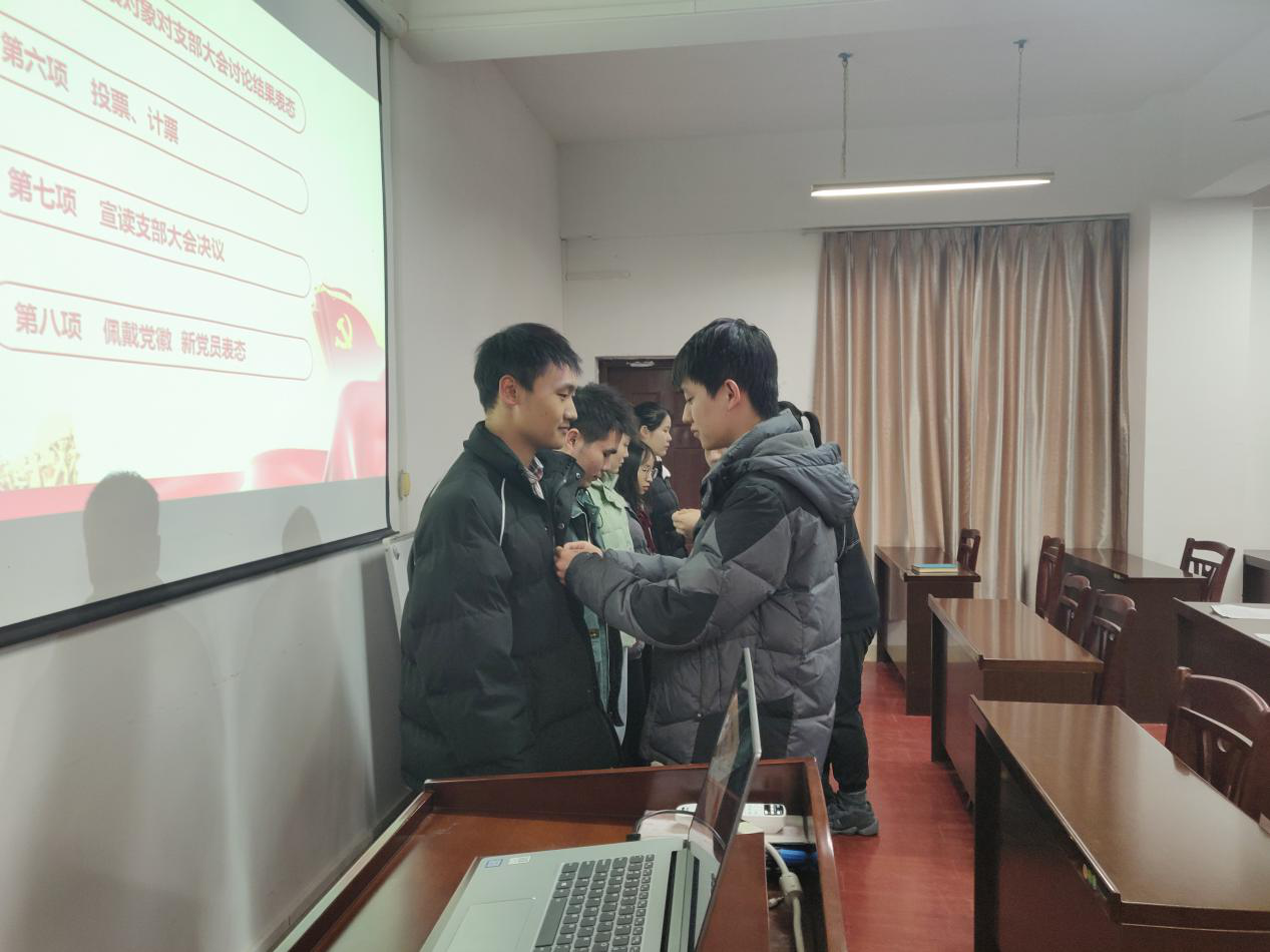 会议伊始,支部书记刘波扬老师宣读了预备党员接受大会的各项流程。随后,陈钟钰等5名拟接收对象逐一宣读《入党志愿书》,并向党组织汇报自身对党的认识、入党动机、个人经历以及在校表现等,紧接着,在场党员对5名接收对象进行客观评价之后,拥有表决权的党员对该5名同志进行不记名投票。经正式党员投票决议,支部一致同意接收陈钟钰等5名同志为中共预备党员,并为他们逐一佩戴党员徽章。