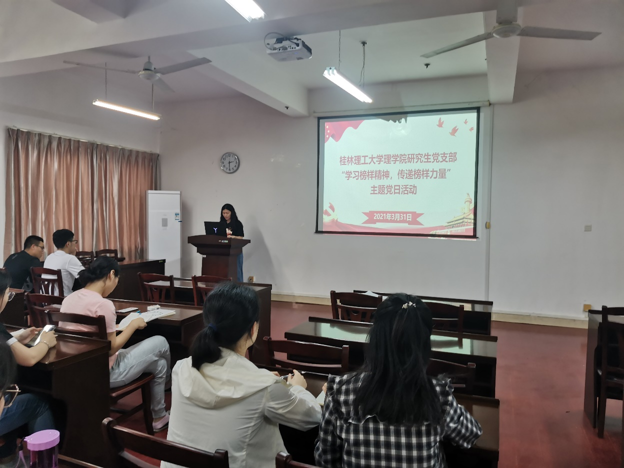 2021年3月31日下午在雁山校区07122教室,太阳集团2007研究生党支部开展“学习榜样精神,传递榜样力量”主题党日活动。活动由支部副书记胡蓉主持,支部全体党员参加。