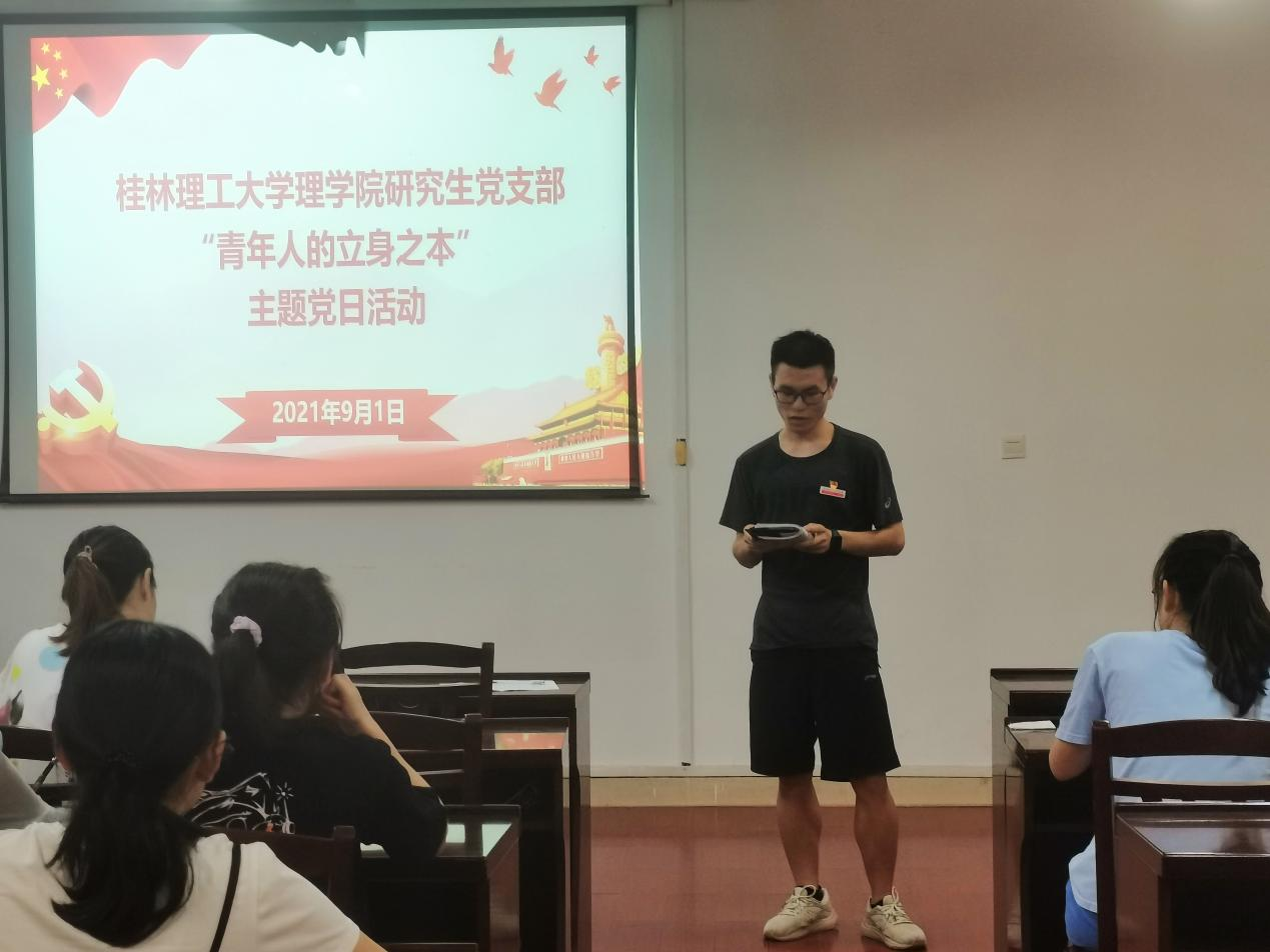 2021年9月1日下午在雁山校区07122教室,太阳集团2007研究生党支部开展“青年人的立身之本”主题党日,本次活动由支部副书记薛任袖主持,支部全体党员参加。