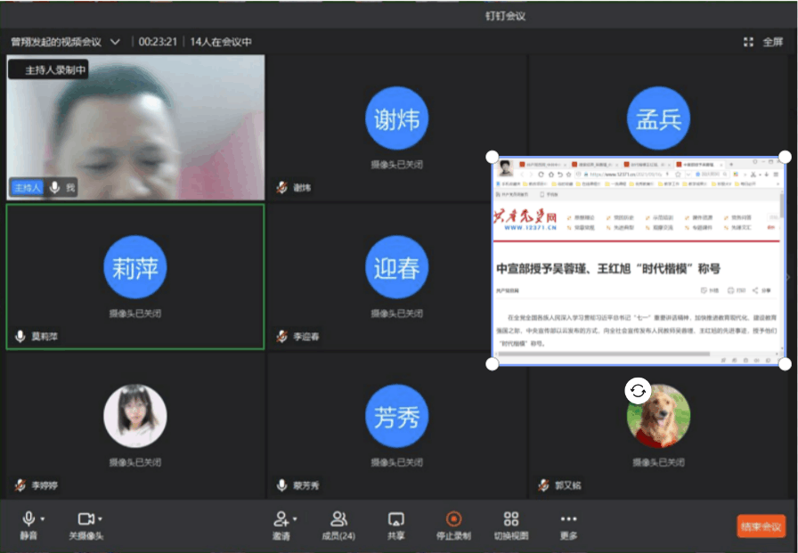 为进一步学习先进典型,营造比学赶强的氛围,提升教工一支部党建工作水平,9月29日,党支部在钉钉会议上开展“学习先进典型,榜样引领前行”主题党日活动。