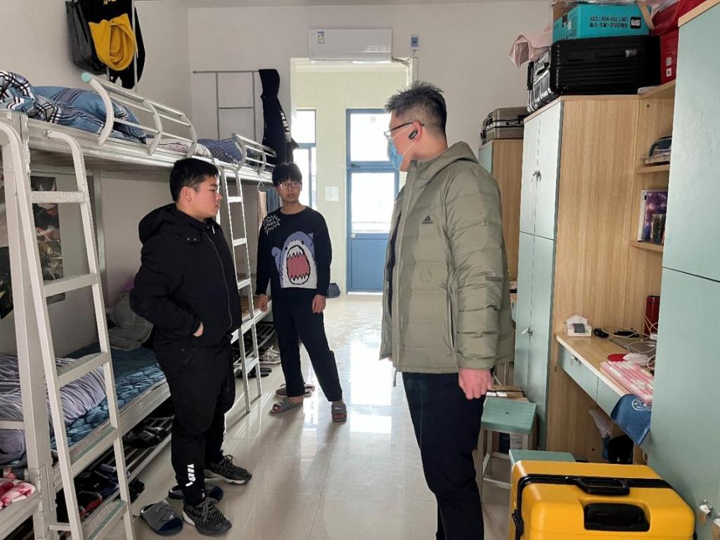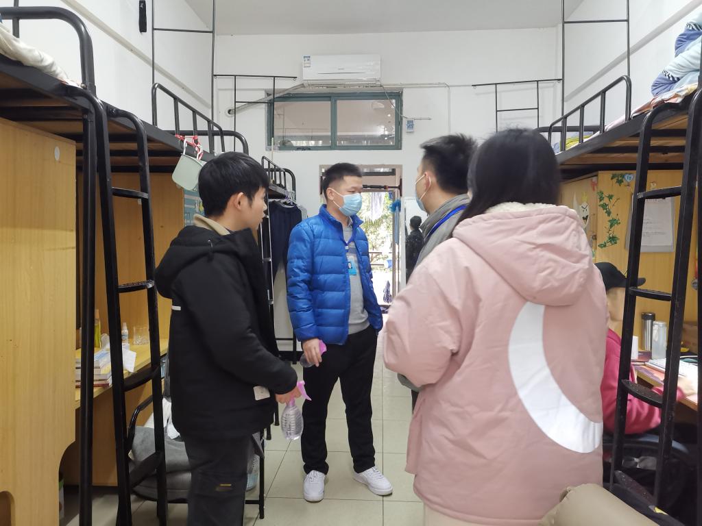 学院党委副书记钟立军(右一)深入宿舍看望首批返校学生