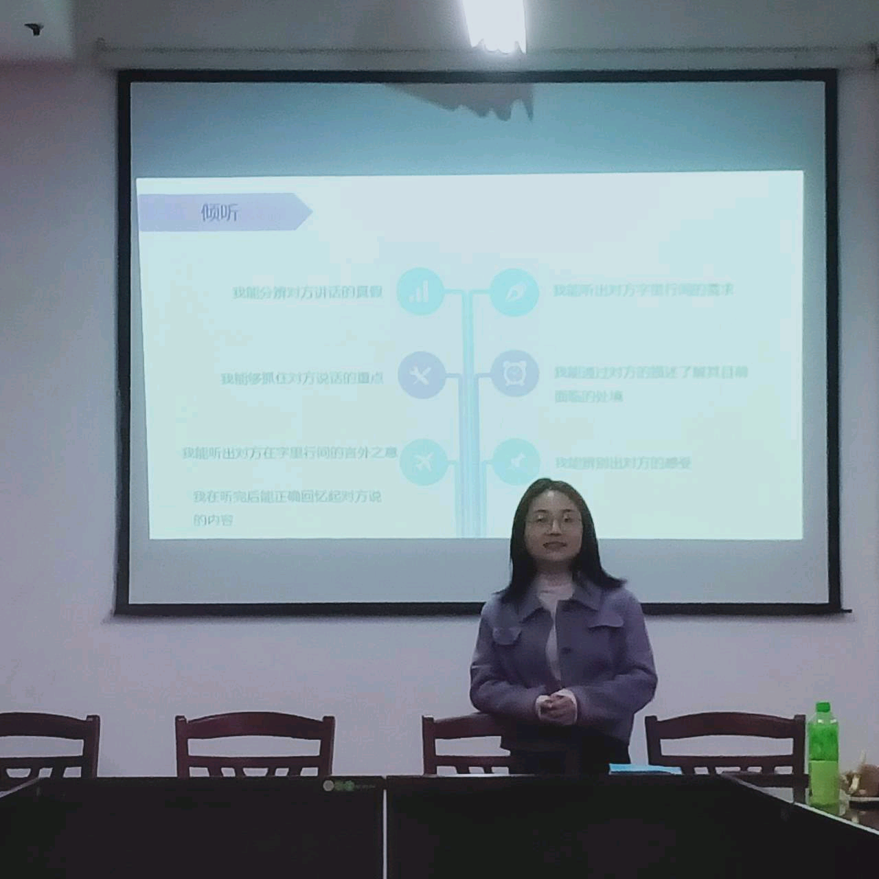 本次培训首先由心理卫生部任冉冉同学从需要特别关注学生的类型、原因以及关注的方法进行了介绍。随后,彭娇娇老师重点讲解了春季学期大学生心理问题多发的原因、表现形式以及调节方法,并通过自己与倾听有关的1-3个特质的自我介绍、包容接纳训练活动等对心理委员如何倾听、谈心谈话,及时了解掌握学生的心理动态,为学生提供科学的心理帮助进行了培训。