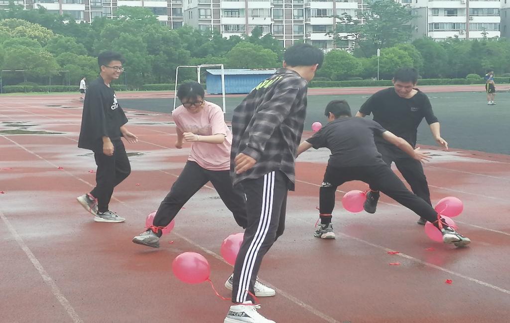 宿舍成员集体参与踩气球项目