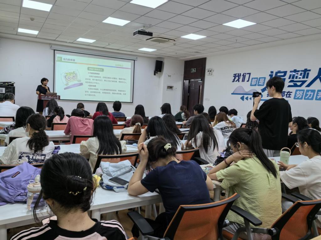熊老师围绕认识压力与情绪、面对压力控制情绪等主题,展开了一场生动而富有启发性的讲座。在讲座中,熊老师引经据典、深入浅出地进行了讲解,不仅展现了其深厚的学术底蕴,更以其独特的见解和生动的语言吸引了学生们的注意力。学生们听得津津有味,深受启发。同时,熊老师也指出,在日常生活和学习中,压力与情绪的管理是每个人都需要面对的重要课题。她鼓励学生们要学会正确认识自己的压力来源,掌握有效的情绪调节方法,从而更好地应对挑战和困难。