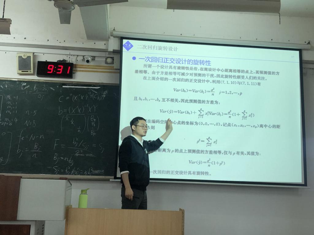 徐老师在课堂上为应用统计学2018级学生讲授了《试验设计》中的“二次回归旋转设计”的内容。主讲老师声音响亮、教态自然、精神饱满、备课充分、条理清晰、上课富有激情。学生在课堂上认真听讲,做好相应笔记,营造出了比较好的课堂氛围。在师生的共同努力下,本次课取得了非常好的效果。