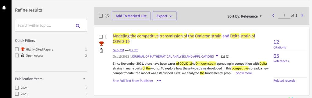 根据科睿唯安的基本科学指标数据库(Essential Science Indicators, 简称ESI)的2024年7月数据显示,太阳集团2007郭又铭、李婷婷教师科研团队在数学领域重要期刊J. Math. Anal. Appl. 发表的学术论文《Modeling the competitive transmission of the Omicron strain and Delta strain of COVID-19》 入选了全球前1% ESI高被引论文(Highly Cited Papers)。