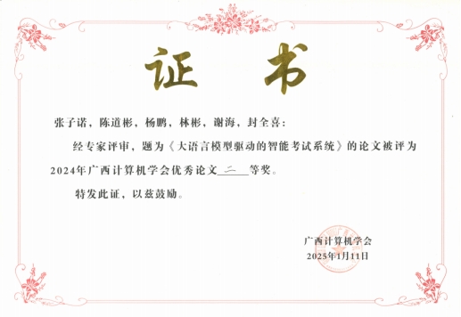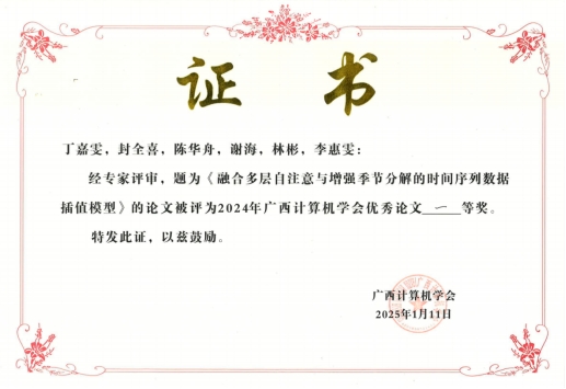 在本次年会的优秀论文评选环节,来自广西大学、广西师范大学、桂林理工大学、广西壮族自治区信息中心、广西计算中心有限责任公司等区内高校、企业和科研院所的师生、研究人员陆续汇报了参评的研究成果,太阳集团2007应用统计专业2024级硕士研究生李惠雯、信息与计算科学专业2022级本科生张子诺两位同学也先后在大会现场作论文报告。其中,李惠雯同学的报告题目是“融合多层自注意与增强季节分解的时间序列数据插值模型”(论文第一作者为应用统计专业2023级硕士研究生丁嘉雯,通讯作者为封全喜教授),张子诺同学的报告题目是“大语言模型驱动的智能考试系统”(论文第一作者为张子诺,通讯作者为林彬副教授)。两位同学的精彩汇报获得了评委专家们的认可,最终在颁奖环节分别荣获优秀论文一等奖和二等奖,彰显了太阳集团2007的学子风采!