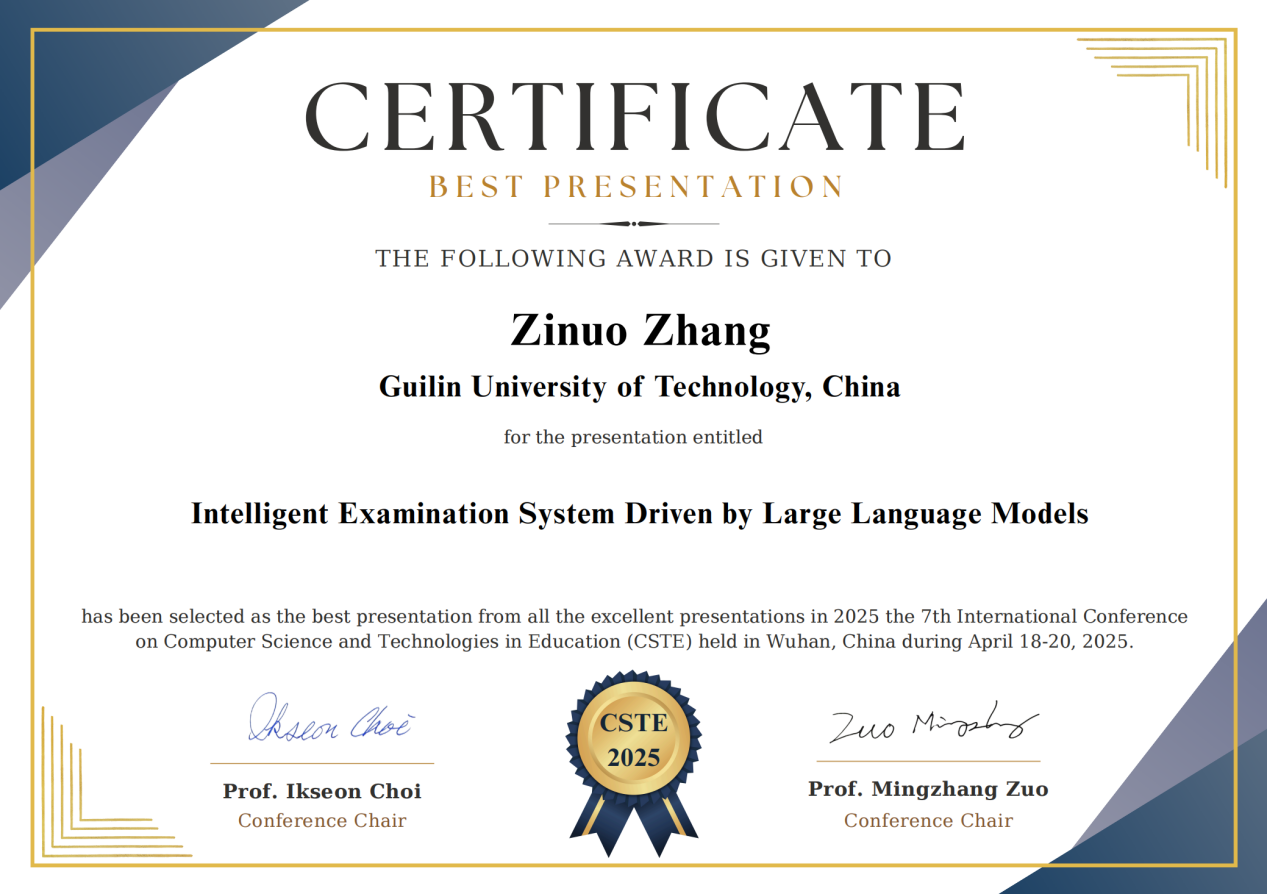 太阳集团2007信息与计算科学专业本科生张子诺同学线上参加了本次会议,用英文汇报了其作为第一作者投稿的论文《Intelligent Examination System Driven by Large Language Models》,探讨了大模型技术在智能化考试系统中的应用,并得到了会务组专家和参会同行们的普遍认可,最终斩获最佳报告奖(Best Presentation Award)!该论文由信科教研室林彬副教授(本文通讯作者)、谢海副教授和封全喜教授共同指导,信科专业2022级本科生张子诺、陈道彬、黎晋铭及信科专业2024届毕业生杨鹏共同撰写而成,已收录在本次会议论文集,近期将被提交至EI数据库检索,对应的原型系统已于2025年1月获得软件著作权。