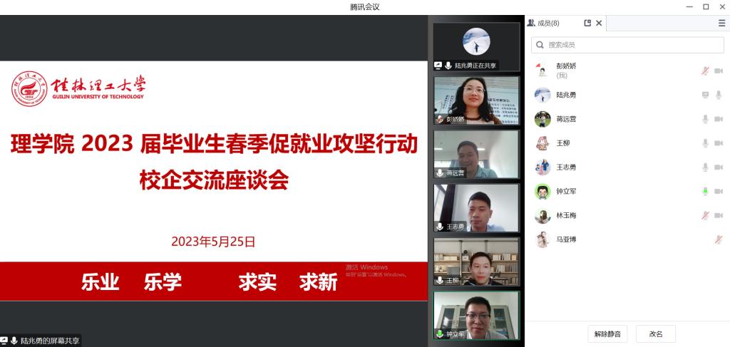 为进一步加强校企合作,促进产学研深度融合,拓宽学生求职渠道和丰富就业机会。5月25日,理学院与广东爱旭科技有限公司通过腾讯会议开展了2023届毕业生春季促就业攻坚行动校企交流座谈会。理学院党委副书记钟立军、副院长蒋远营、教研室主任以及2023届、2024届毕业班辅导员,广东爱旭科技有限公司CHO陈茂欣、人力总监巩运来、招聘主管陆兆勇参加此次会议。